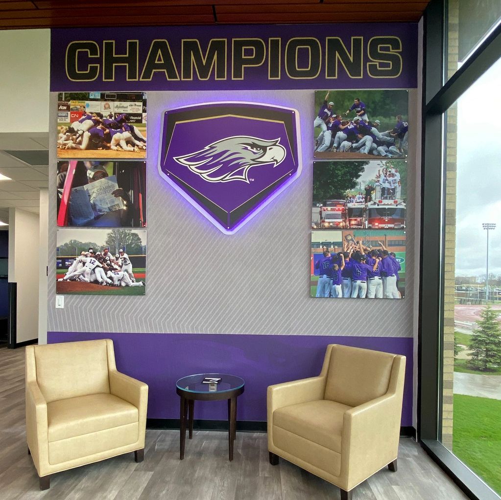 This feature wall was created for UW Whitewater. It is built with Texwalk, PVC boards with standoffs and our back lit logo centerpiece.